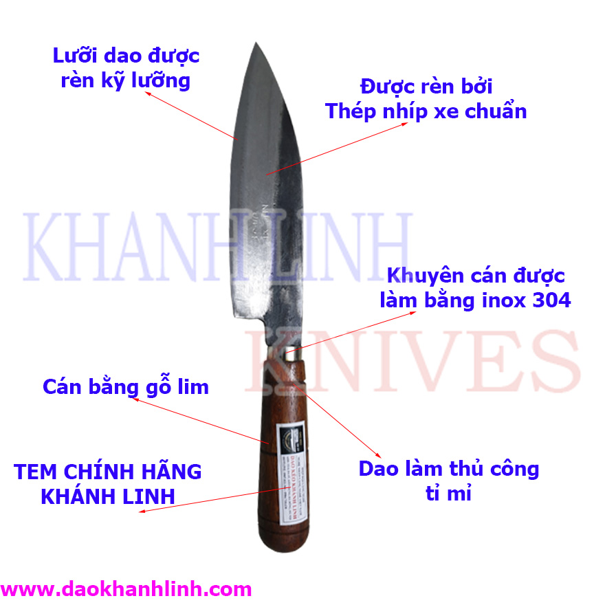 - Cam kết dao được rèn bằng nhíp xe ô tô, cán dao bằng gỗ lim chắc chắn, khuyên dao bằng inox dày.