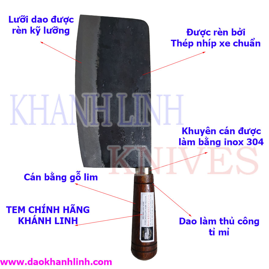 - Cam kết dao được rèn bằng nhíp xe ô tô, cán dao bằng gỗ lim chắc chắn, khuyên dao bằng inox dày.